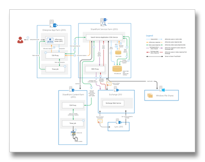 Illustrations for cross-server features: This multi-tab file includes descriptions and architecture illustrations for features that work across Microsoft Office server products. (Exchange Server, Lync Server, SharePoint Server)